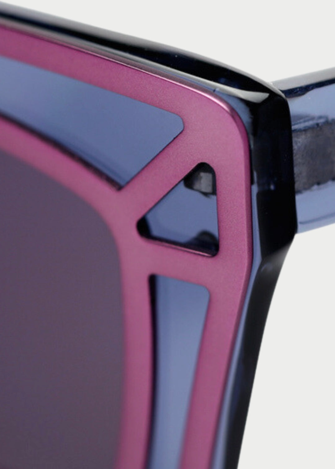 The Scorpius is a flashy remake of one of Ksubi's most famous frames (Skeleton). The frame is outlined in a purple metallic “skleleton” which is filled in with a translucent blue smoke acetate.