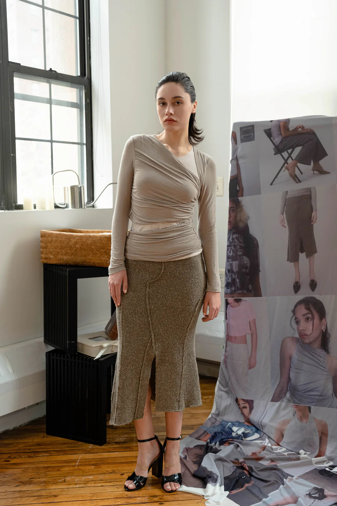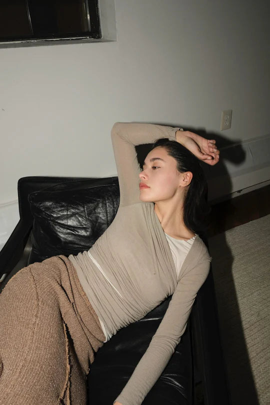 This top features a soft, stretchy fabric that wraps elegantly around the body, creating a flattering, ruched effect. With long sleeves and a subtle neutral tone, it's perfect for layering or wearing on its own. Its versatile design makes it ideal for both casual days and dressier occasions, offering comfort and effortless style.