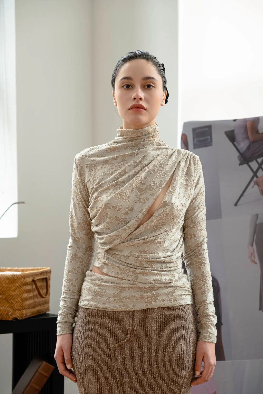 This top brings sleek vibes with its draped, asymmetrical cut and subtle cutouts that add an edge. The long sleeves and high neckline with the gathered details hug the body just right. It's the perfect blend of effortless style and statement-making design for day or night.